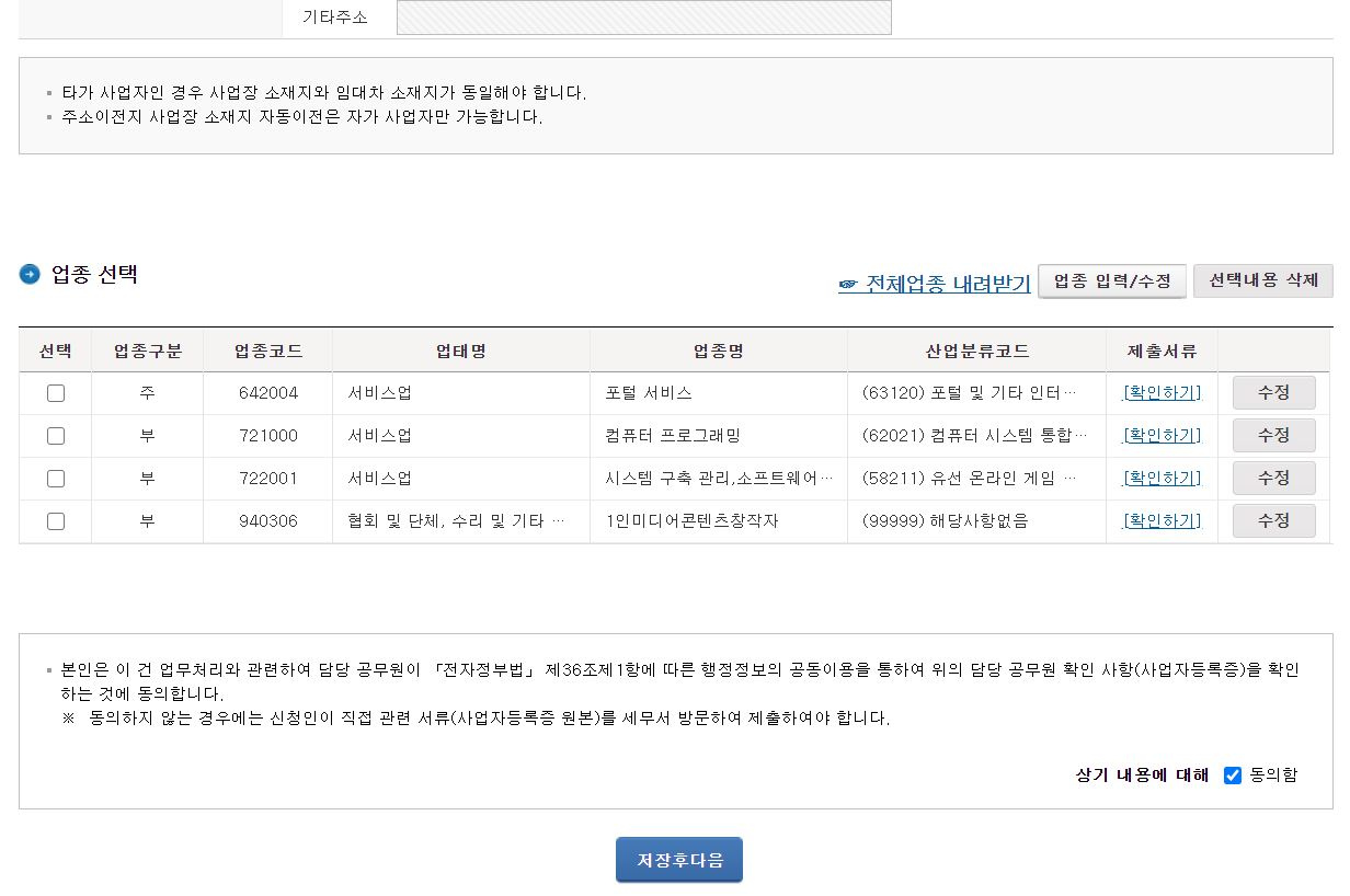 사업자 정보 및 추가된 업종 확인이 가능합니다. [저장후 다음] 클릭