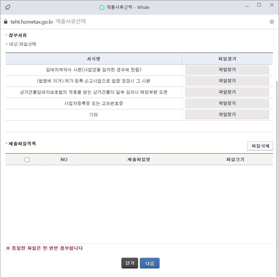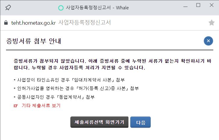 [다음]을 누르면 최종적으로 증빙서류 첨부 안내 화면이 한번 더 뜹니다. [다음]클릭