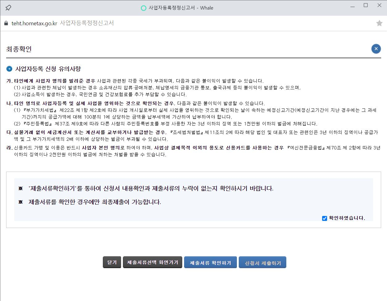 6. ㅁ확인 체크 후 [제출서류 확인하기]한 다음 서류를 확인하고, [신청서 제출하기]클릭하면