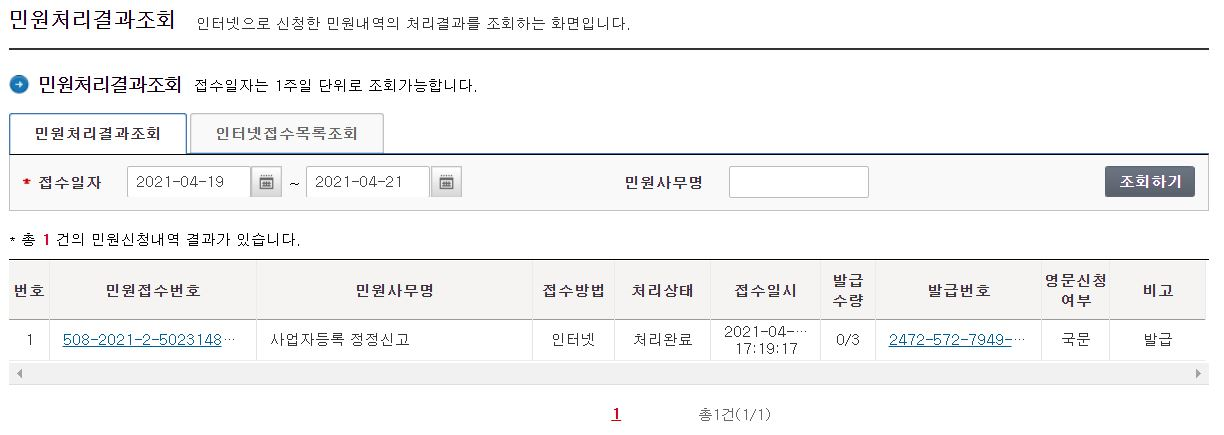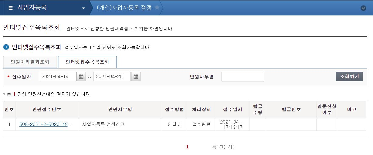 7. 사업자등록 신청·정정 · 휴폐업 > 민원신청 처리결과 조회 메뉴에서