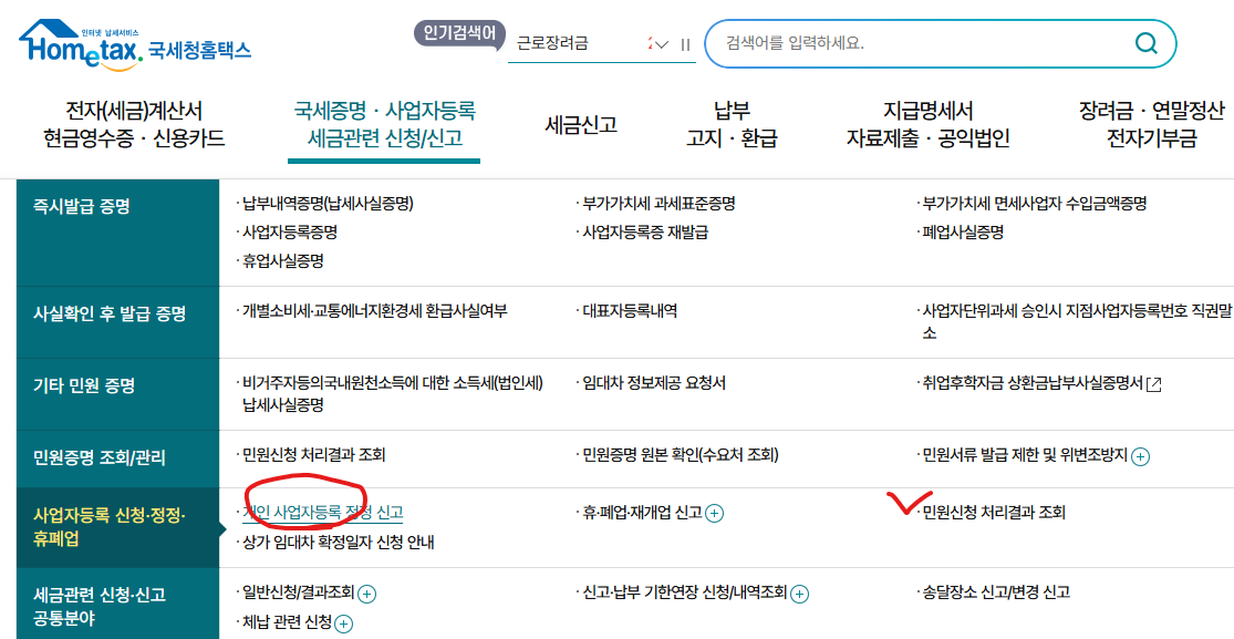 국세증명·사업자등록 세금관련 신청/신고 > 사업자등록 신청 ·정정 ·휴폐업 > 사업자등록 정정 신고