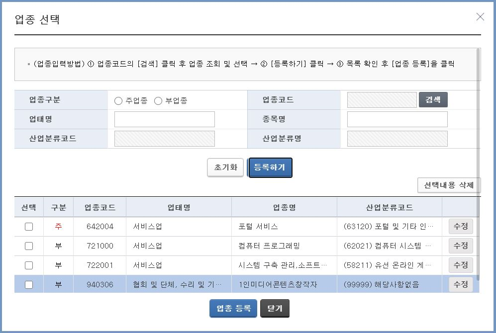 업종구분 > 부업종 체크 하고 [등록하기] 하면 아래 부업종이 추가됩니다.